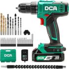 DCA Taladro atornillador inalámbrico, par de 40 Nm, portabrocas automático de 10 mm, taladro eléctrico con batería de 2,0Ah y cargador, 18+1 posiciones, kit de taladro 20V de 25 piezas, ADJZ2035