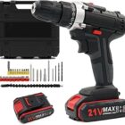 Conjunto de perforación eléctrica sin cuerda de 21v, perforación eléctrica sin cuerda con caja de herramientas, perforadora eléctrica sin cuerda con batería 2×1,2ah, 2 velocidades, nivel 25, luz led