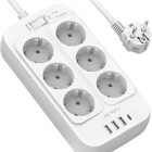 JSVER Regleta Enchufe,4 Puertos de USB(3 USB A+1 USB C) y 6 Tomas Regleta Proteccion Sobretension Enchufe Alargador Multiple Carga para iPad iPhone Tablets – Cable 2m-Blanco