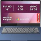 Lenovo IdeaPad Slim 3 Chromebook Gen 8 – Ordenador Portátil 14" FHD (MediaTek Kompanio 520, 4GB RAM, 64GB eMMC, Arm Mali-G52 2EE MC2 GPU, ChromeOS) BLU – Teclado QWERTY Español