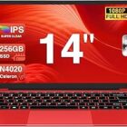 Ordenador Portátil 14",6GB+256GB SSD N4020(hasta 2.8Ghz) Win 11 PC 1920×1080 FHD Dual WiFi BT 4.2 Soporta 1TB SSD Expansión con Ratón Inalámbrico para Trabajo-Estudio-Aprendizaje-Rojo