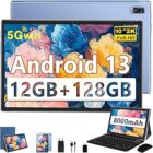 fezawio Tableta de 10 Pulgadas, Tableta Android 13, 2.0ghz, Ocho núcleos, 12 GB de Ram + 128 GB de ROM, TF 512GB, Bluetooth 5.0, reconocimiento Facial, Teclado + Funda de Cuero + ratón, Azul
