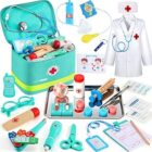 Perbabe Maletín Médico de Madera con Estetoscopio Real, Bata y Gorro – Kit Doctor 32 Piezas – Juguete Educativo de rol para Niños 3 4 5 6 7 8 9 10 Años Regalo para Cumpleaños/Navidad