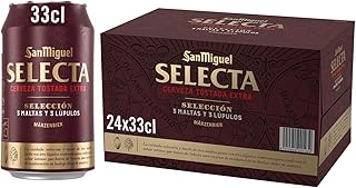 Pack de 24 Latas x 330ml: cerveza San Miguel Selecta con 6,2% de volumen de alcohol, es una cerveza extra de maduración en bodega, elaborada con una selección de 3 lúpulos y 3 maltas con distinto tostado. Una cerveza tostada extraordinaria. Para un mayor disfrute, se recomienda consumir entre 6º y 9º grados