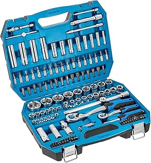 Juego de herramientas artesanales muy amplio con 144 piezas: diferentes tipos de llaves de vaso, incluye llaves de bujía, puntas de destornillador de diferentes tamaños, también en conectores, un mango giratorio, algunas extensiones y, por supuesto, un trinquete