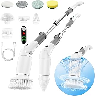 【Cepillo de limpieza electrico mejorada】Velocidades de 450-550 RPM / Mango retráctil y desmontable / 8 cabezales de cepillo reemplazables / IPX6 impermeable / Tipo-C / 90 minutos de tiempo de trabajo / Diga adiós a la limpieza tradicional, disfrute de la comodidad de la tecnología a la vida, este cepillo limpieza le aportará un nuevo entorno vital. Nota: se recomienda retirar el cabezal del cepillo por separado para su limpieza, y no sumerja completamente el producto en agua.