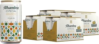 Pack de 24 latas de 25 cl de cerveza lata Alhambra lager especial, lupulación y sabor equilibrados.