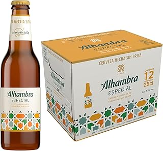 Pack de 12 botellines de 25 cl de cerveza Alhambra lager especial, lupulación y sabor equilibrados.