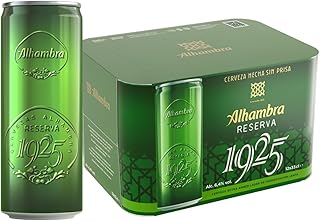 Pack de 12 latas de cerveza Alhambra extra; equilibrada e intensa, cerveza Alhambra 1925 Reserva está elaborada con la variedad de lúpulo Saaz, que le aporta toques ligeramente florales
