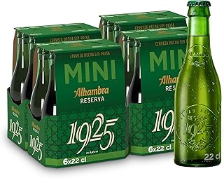 Pack 24 botellas MINI de 22,5 cl de cerveza Alhambra 1925 Reserva. Equilibrada e intensa, está elaborada con la variedad de lúpulo Saaz, una de las más exclusivas, que le aporta toques ligeramente florales
