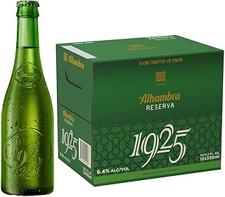 Pack de 12 botellas de cerveza extra. Equilibrada e intensa, Alhambra Reserva 1925 está elaborada con la variedad de lúpulo Saaz, una de las más exclusivas, que le aporta toques ligeramente florales.