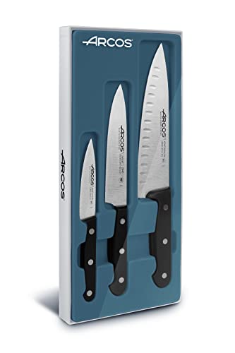 El juego de cuchillos Arcos Serie Universal se compone de 3 cuchillos básicos y muy necesarios en cualquier cocina. Un set estrella para realizar diferentes tipos de corte en pescados, carnes, frutas y verduras. Se encuentran presentados en un bello estuche de interior rojo. Los tres cuchillos están finamente diseñados para adaptarse a cualquier tipo de mano.