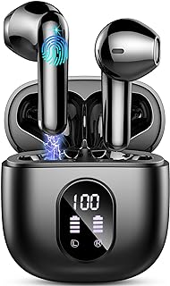 50H de Reproducción y Pantalla LED Doble: Los cascos bluetooth proporcionan 8 horas de reproducción con una sola carga, que se pueden ampliar a 50 horas con el estuche de carga. Y adopta el puerto de carga USB-C, admite carga rápida y solo toma 1 hora cargar completamente los wireless earbuds. Además, auriculares inalámbricos bluetooth están equipados con una pantalla LED doble que muestra con precisión el nivel de energía del estuche de carga y de los cascos inalámbricos.