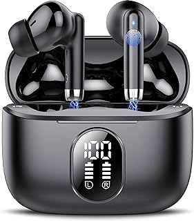[40 horas de tiempo de reproducción y pantalla digital LED]: Una sola carga de los auriculares inalambricos bluetooth deportivos proporciona hasta 7 horas de uso, y con el estuche de carga, el tiempo total de uso se extiende a 40 horas. El cable USB-C garantiza una carga eficiente y carga completamente el estuche en 1,5 horas. La pantalla digital LED muestra de forma precisa e intuitiva la duración restante de la batería y el progreso de carga del estuche.