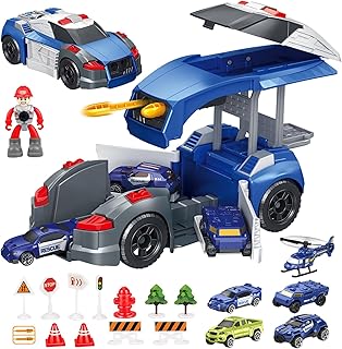 Juguetes de camión multifuncionales: Nuestro coche de policía cuenta con función de expulsión con un solo toque, estacionamiento y espacio de almacenamiento. Incluye 1 coche de policía, 4 minicoches, 1 helicóptero, 1 trabajador de la construcción y 12 accesorios.