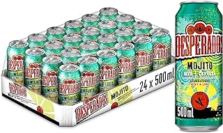 Cerveza innovadora de tipo Lager aromatizada con tequila, menta y limón verde Con 5.9% de alcohol en volumen Desperados Mojito con la frescura frutal del famoso Mojito, te transportara directamente a las noches caribeñas; refrescante y de cuerpo ligero Ingredientes: Agua, malta de cebada, jarabe de glucosa, azúcar, extracto de lúpulo, regulador de la acidez: ácido cítrico, aromatizante (50% de tequila, 14% extracto de menta, 1% extracto de lima) Consumirla directamente de la botella entre 2° y 4°C para obtener sus máximas cualidades