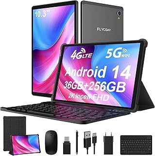 FLYCOAY 2K Tablet 10,4 Pulgadas, 4G LTE+5G WiFi, 36GB RAM+256GB ROM (2TB TF), Android 14 Tablet PC, Octa-Core 2.0 GHz, 2000 * 1200 FHD, 8000mAh, 13MP+8MP, GPS/BT5.0, Tablet con Teclado etc.(Negro)