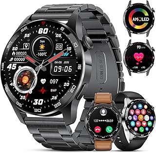 【AMOLED Screen Smartwatch】Smartwatch está diseñado con AMOLED pantalla completa de bajo consumo de energía, con 466 * 466 de resolución, alta calidad de color y capacidad de respuesta táctil, que puede presentar más ricos detalles de marcación. Le da al reloj una excelente claridad y visibilidad incluso al aire libre. En comparación con la pantalla LCD tradicional, la pantalla AMOLED ahorra más energía y energía.