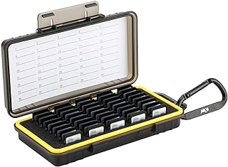 Ranura para tarjetas de cojín de esponja moldeada: ranuras personalizadas para sostener enérgicamente, funda con mosquetón para un fácil transporte, protector resistente y duradero a prueba de golpes para almacenamiento de tarjetas de memoria. Todas las esquinas y bordes de la carcasa están biselados y pulidos para evitar arañazos no deseados.