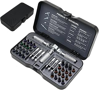 Resistencia al Desgaste: Conjunto destornilladores de trinquete fabricado en compuesto resistente a la oxidación. Textura antifatiga y forma ergonómica aseguran confort y larga duración incluso en usos intensivos.