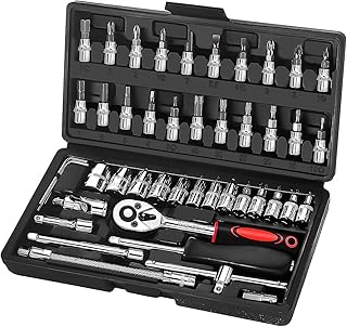 KeZaara 46 Piezas Juego de Llaves de Vaso con Llave Carraca 1/4", Juego de Llaves de Vaso Cromadas, Juego de Llaves de Trinquete y de Tubo Adecuado para Trabajar en Bicicletas y Coches