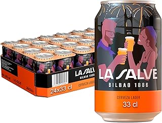 Pack de 24 latas de 33 centilitros cada uno de La Salve Auténtica, con 5% de alcohol. Para un mayor disfrute, se recomienda consumir entre 3º y 6º C
