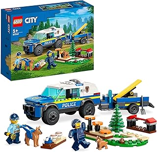 Este juguete de policía de LEGO City cuenta con un increíble coche todoterreno con remolque, 2 mini figuras, una figura de un perro, una de un cachorro y un set de 3 obstáculos para simular un entrenamiento canino de la policía