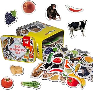 MAGDUM 85 Gran JUEGO de REGALO 4 en 1 Bebé Mundo imanes de TAMAÑO GRANDE: Zoo + Granja ANIMALES & FRUTAS & VERDURAS refrigerador imán niños juguetes educativos incluye 85 imanes. Conveniente CAJA DE METAL brillante Caja le ayudará a almacenar el producto después de su uso y llevarlo con usted en VIAJES – juguetes para la creatividad y el desarrollo del lenguaje. EL MEJOR REGALO PARA CUMPLEAÑOS O NAVIDAD.