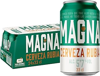 3 Packs de 8 latas (24 latas en total) de 33 cl cada una. Magna es una cerveza dorada lager, con 5.7% de alcohol. Cuenta con una elaboración inspirada en el estilo Helles ExportBier alemán y da como resultado una cerveza de cuerpo medio, con sabor elegante y complejo. Para mayor disfrute, se recomienda consumir entre 4º y 6º grados