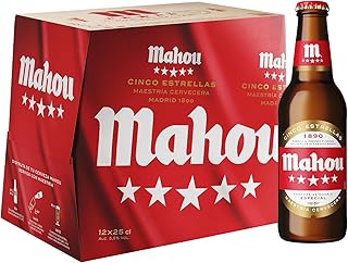 Pack de 12 botellas de 25 centilitros cada una de Mahou 5 estrellas, cerveza icónica nacida hace más de 40 años para satisfacer a los paladares más exigentes, con 5,5% de alcohol. Para un mayor disfrute se recomienda consumir entre 4º y 6º C