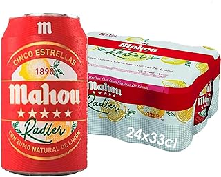 Mahou Cinco Estrellas Radler en pack de 12 lata de 33 centilitros y 3.2% de alcohol. Para un mayor disfrute se recomienda consumir entre 4º y 6º C