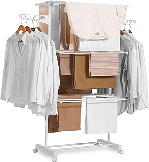 GRAN CAPACIDAD CON PLEGADO COMPACTO: el tendedero vertical tiene 15 metros de secado repartidos en 4 niveles con 7 varillas cada uno, excepto el último. También cuenta con 12 espacios para perchas. Ahorra espacio cuando no está en uso doblando cada estante individualmente. Dimensiones del producto: abierto 150 (alto) x 136 (ancho) x 57 (profundidad) cm / cerrado 150 (alto) x 74 (ancho) x 42 (profundidad) cm.
