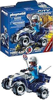 Contenido: 1x PLAYMOBIL City Action Policía – Speed Quad, Juego de 21 piezas con instrucciones: 1 coche de juguete, 1 figura, 19 accesorios, Material: Plástico, LxAxP: 9,5 x 7 x 7,5 cm, Peso: 83 g, 71092