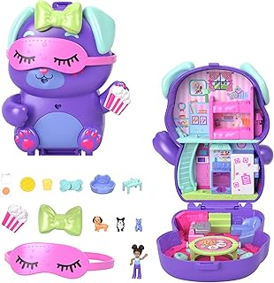 Este Estuche Perrito fiesta de pijamas de Polly Pocket incluye 1 muñequita y 10 accesorios, incluidos 2 perros