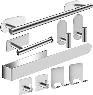 9 Piezas Toalleros de Baño Sin Taladro: Este juego de accesorios baño incluye 1 piezas toalleros de baño, 1 piezas toallero adhesivo, 1 piezas portarrollos papel higienico, 2 piezas ganchos para batas, 2 piezas ganchos para toallas y 2 piezas ganchos para maquinillas de afeitar. Elegante y exquisito, este juego de accesorios baño sin taladro satisface todas sus necesidades en la vida diaria, haciendo que su baño y cocina se vean más elegantes y ordenados.