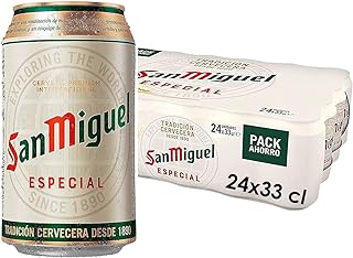Pack 24 latas de 33 cl cada una: cerveza San Miguel Especial, cerveza dorada lager, elaborada con experiencias, conquistando el mundo gracias a su sabor y espíritu aventurero desde 1890, con 5.4% de alcohol. Para un mayor disfrute se recomienda consumir entre 4º y 6º C