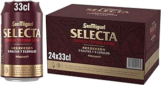 Pack de 24 Latas x 330ml: cerveza San Miguel Selecta con 6,2% de volumen de alcohol, es una cerveza extra de maduración en bodega, elaborada con una selección de 3 lúpulos y 3 maltas con distinto tostado. Una cerveza tostada extraordinaria. Para un mayor disfrute, se recomienda consumir entre 6º y 9º grados