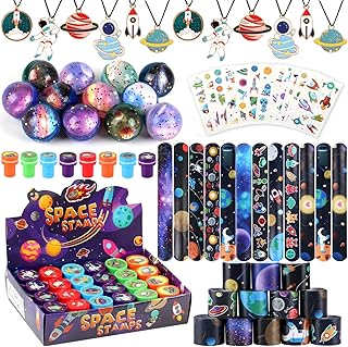 72 Piezas Todo Incluido – 24× sellos espacio, 12× pulsera bofetada, 12× collares niños, 12 pelotas saltarinas, 12× Tatuajes Temporales.