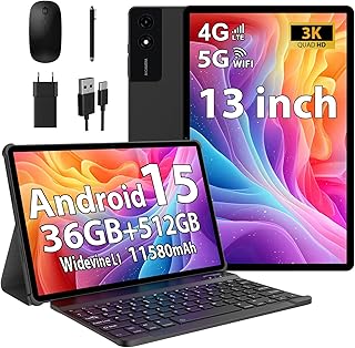Tablet 13 Pulgadas Android 15 con 36GB RAM+512GB ROM(TF 2TB), 4G LTE/SIM & 5G WiFi, INCEL 3K HD, 11580mAh /Octa Core/Gemini AI/13MP+8MP/18W/90Hz/GPS/Widevine L1/BT 5.0, Tablet con Teclado,Negro
