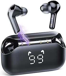Indicador de potencia LED y 60 horas de reproducción: Los auriculares están equipados con una pantalla digital de luz fría LED de alta precisión que muestra con precisión la corriente restante. Disfruta de 6 horas de tiempo misic desde una sola carga, y extiende hasta 60 horas con la carcasa de carga compacta de 800 mAh.