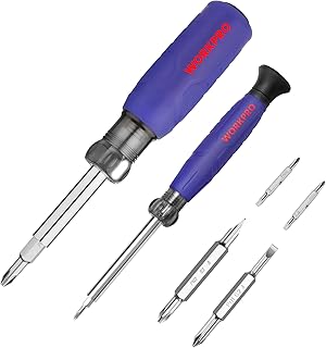 【6 en 1 destornillador】 WORKPRO El destornillador reversible 6 en 1 tiene 2 puntas (PH1&SL4, PH2&SL6) y 1 alargadera de doble cara como llave de vaso (hexagonal 5/16″, 1/4″).