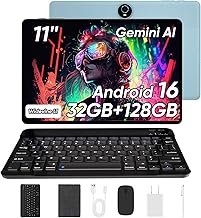 WXUNJA Android 16 Tablet with Keyboard, 11 Inch, 32GB RAM+128GB Storage, 1TB Expand, 8000mAh Battery, 5MP+8MP Camera, Dual Band WiFi 6, IPS Touch Screen, Mouse/Stylus/Case/Charger Inside, Light Blue