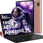 DMOAO Tablet 10 Pulgadas Android 14 con 5G Wi-Fi 6, FHD Tablet con 18 GB RAM + 128 GB ROM (Ampliable a 1TB), Widevine L1, 8 Cores, BT 5.0, 6000mAh, USB-C, Teclado + Ratón + Funda, Nero, Oro Rosa