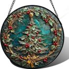 DASTOLL Stained Glass Window Hangings – Red Gold Green Wreath Suncatcher for Door Home Christmas Tree Decoration Sun Catcher Thanksgiving New Year Birthday Gift for Women Men Mom Grandma 7.8 in